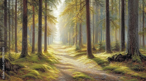© gudangPIXEL, Obraz premium Sunlit Path Through a Serene Forest