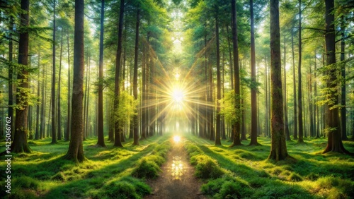 © Arethaawykoff, Obraz premium Sunlit Path Through a Tranquil Forest