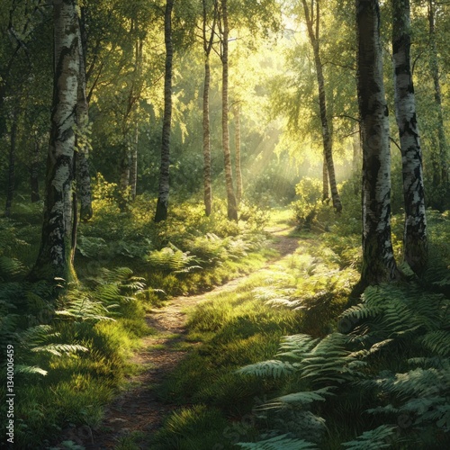 Fototapeta premium Sunlit Path Through a Verdant Birch Forest, a Serene Nature Escape