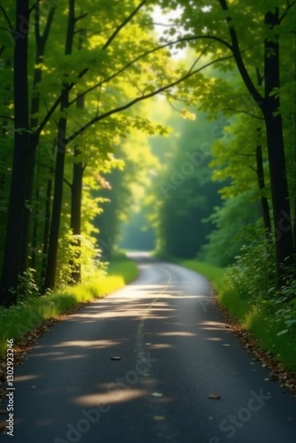 Obraz premium Sunlit Path Through a Verdant Forest Canopy, Winding Road Beckoning the...