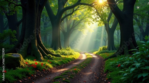 Naklejka premium Sunlit Path Through an Enchanting Forest with Lush Greenery and Vibrant Flowers