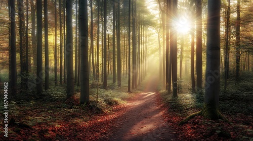 © Shipons Creative, Fototapeta premium Sunlit path through autumn forest with fallen leaves and tall tree trunks