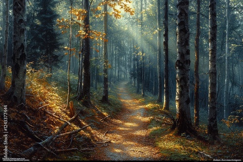 © boler, Obraz premium Sunlit Path Through Autumnal Forest Trees