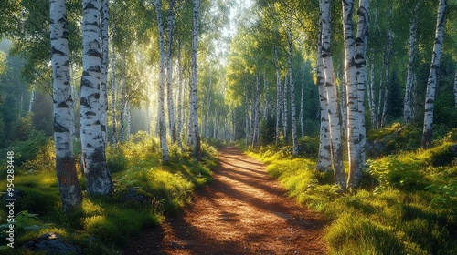 Obraz premium Sunlit Path Through Birch Forest