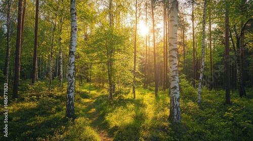 © gentho, Fototapeta premium Sunlit path through birch forest, dappled light and shadows on lush green undergrowth