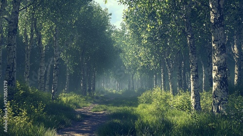 © A4719, Fototapeta premium Sunlit Path Through Birch Tree Forest