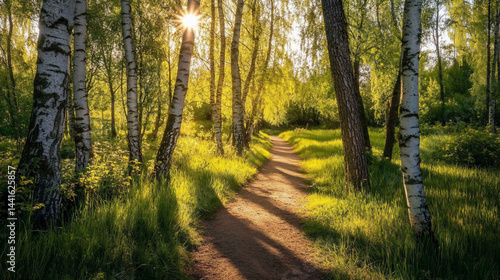 Fototapeta premium Sunlit path through birch trees (2)