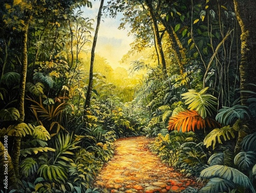 Fototapeta premium Sunlit Path Through Dense Tropical Rainforest with Lush Greenery and Vibrant...