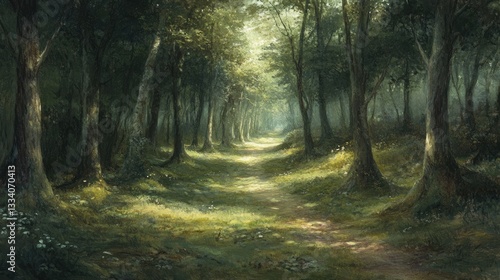 Naklejka premium Sunlit Path Through Enchanting Forest