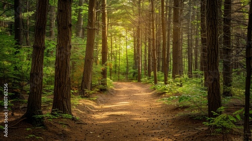 © benjamas, Obraz premium Sunlit Path Through Forest.