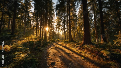 Fototapeta premium Sunlit Path Through Forest at Sunset, Emphasizing Natural Beauty and Outdoor...