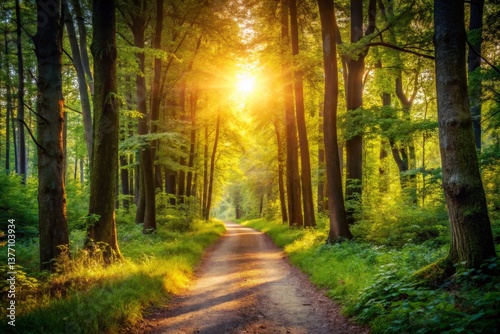 © Arethaawykoff, Obraz premium Sunlit Path Through Forest Trees