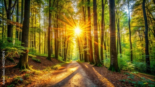 © Arethaawykoff, Obraz premium Sunlit Path Through Forest Trees