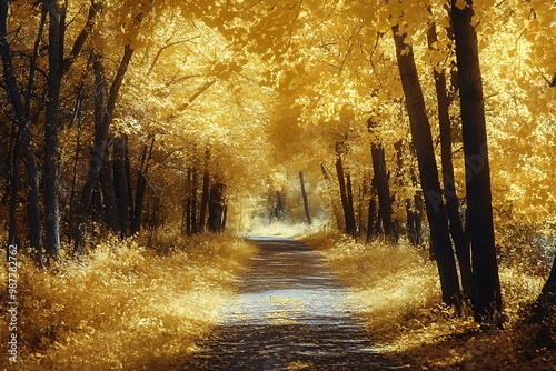 © atar, Obraz premium Sunlit path through golden autumn forest
