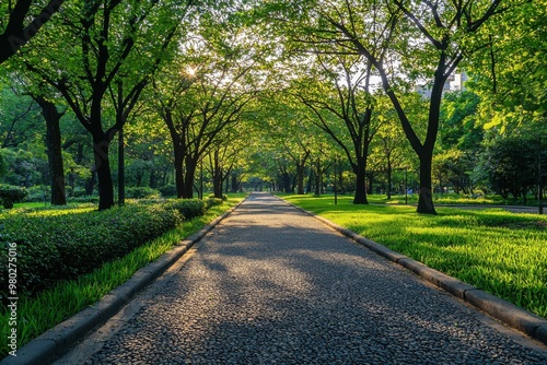 © Nutthanon, Fototapeta premium Sunlit Path Through Green Trees.