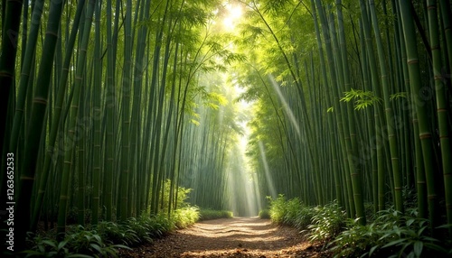 Obraz premium Sunlit Path Through Lush Bamboo Forest