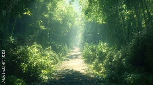 © Ali, Obraz premium Sunlit path through lush, green bamboo forest.