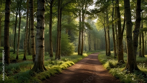 © Syarif, Fototapeta premium Sunlit path through lush green forest.