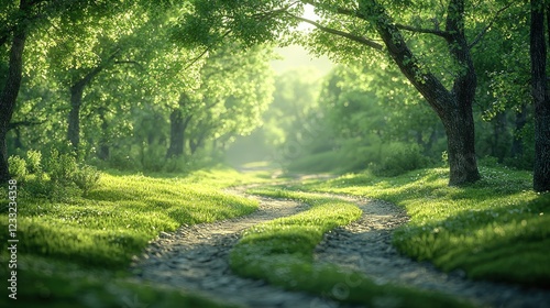 Fototapeta premium Sunlit Path Through Lush Green Forest