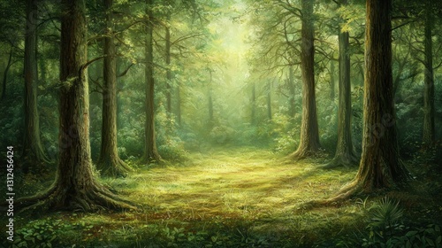 Obraz premium Sunlit path through lush green forest.