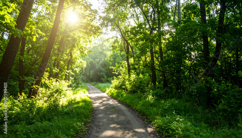 Obraz premium Sunlit Path Through Lush Green Forest