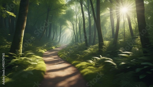 Obraz premium Sunlit Path Through Lush Green Forest