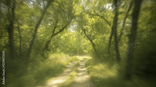 © Yopi, Obraz premium Sunlit Path Through Lush Green Forest A Dreamy Summer Day Scene