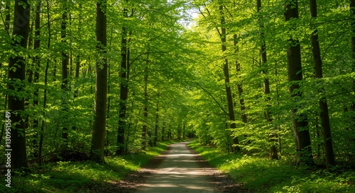 © Phung, Obraz premium Sunlit Path Through Lush Green Forest. AI Generated