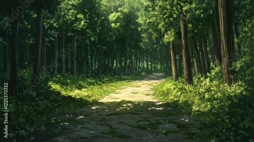 © Rere_Art151, Fototapeta premium Sunlit Path Through Lush Green Forest Canopy