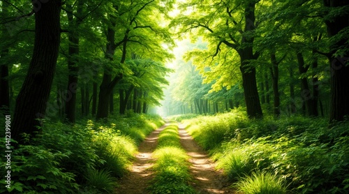 Obraz premium Sunlit Path Through Lush Green Forest in Summer