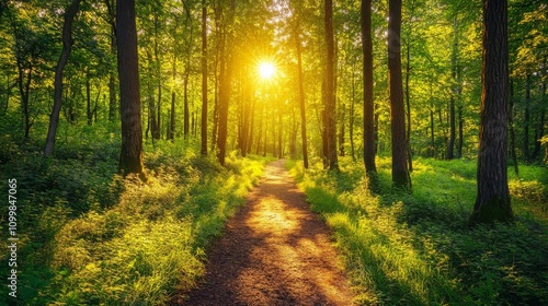 © addymawy, Obraz premium Sunlit Path Through Lush Green Forest Trees