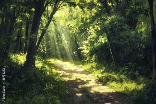 Fototapeta premium Sunlit Path Through Lush Green Forest Trees