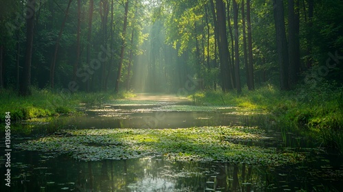 © Alfi, Obraz premium Sunlit Path Through Lush Green Forest with Calm River