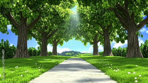 © AKarawat, Obraz premium Sunlit Path Through Lush Green Trees and Grassy Fields