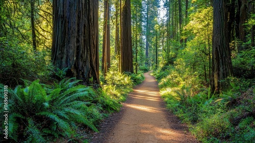 Obraz premium Sunlit Path Through Lush Redwood Forest with Ferns and Shadows