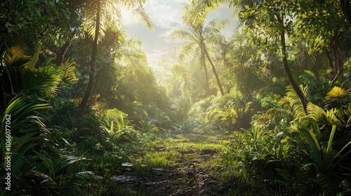 Obraz premium Sunlit Path Through Lush Tropical Jungle