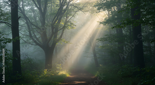© F2 MEDIA, Fototapeta premium Sunlit Path Through Misty Forest
