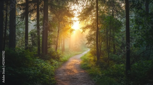 © SlashStd, Naklejka premium Sunlit path through misty forest at dawn.