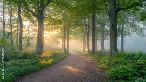 © dany, Fototapeta premium Sunlit path through misty forest at dawn