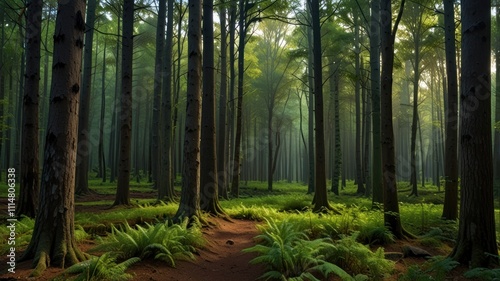 © Syarif, Obraz premium Sunlit path through misty forest with ferns.