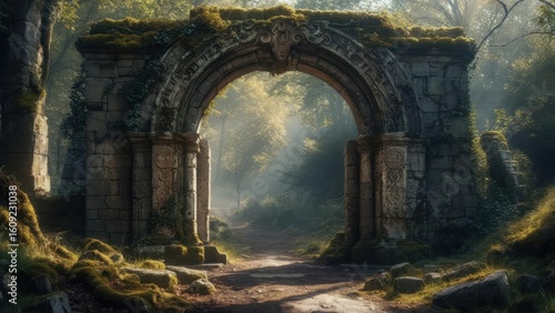 © Adi, Fototapeta premium Sunlit path through mossy stone archway in forest