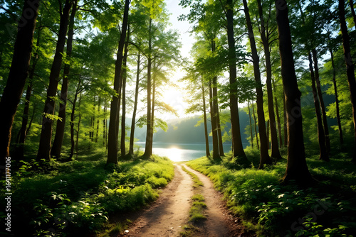 © fitria, Fototapeta premium Sunlit Path Through Serene Forest Leading to Tranquil Lake Scene