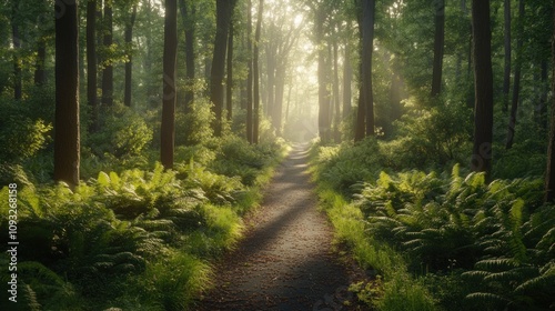 Obraz premium Sunlit Path Through Verdant Forest With Ferns