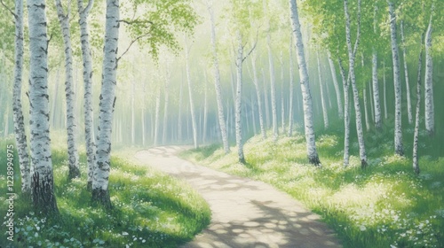 © BerkahStock, Obraz premium Sunlit path winding through a birch forest.