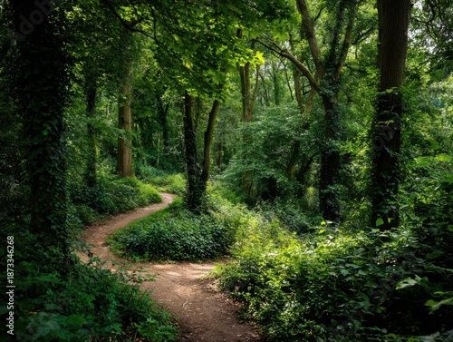 © Johannes, Fototapeta premium sunlit path winding through a dense vibrant woodland