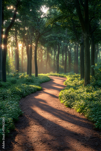 Fototapeta premium Sunlit path winding through a lush green forest at sunrise.
