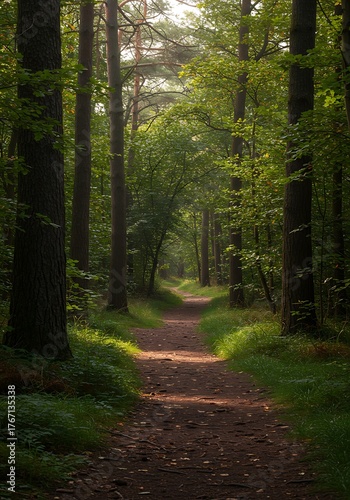 © dwi, Obraz premium Sunlit Path Winding Through a Lush Green Forest Canopy.