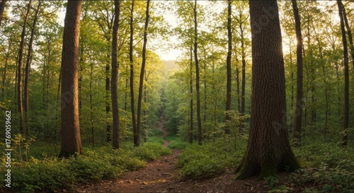 Fototapeta premium Sunlit path winds through dense forest, tall trees frame the scene