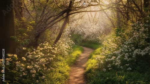© Ardiansyah, Fototapeta premium Sunlit Path with Spring Blossoms.
