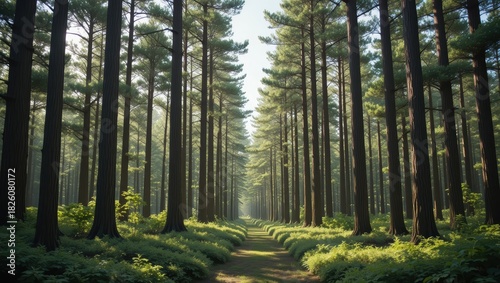 Obraz premium Sunlit Pathway Through a Dense Forest of Tall Evergreen Trees in Early...